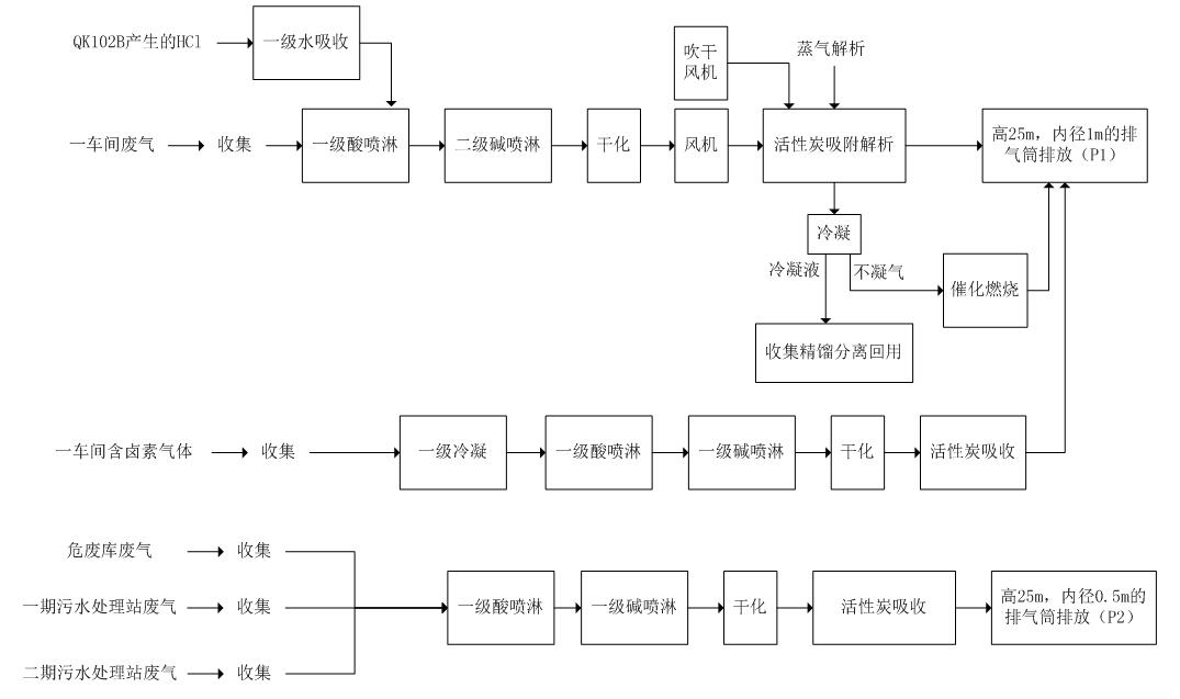 废气进入冷凝器,去除部分有机溶剂,再进入酸洗塔、碱洗塔,去除废气中的酸碱成分,后进入干化器,去除废气水分,后进入活性炭吸附装置,吸附VOCs,洁净气体通过排气筒达标排放。活性炭吸附装置为非再生式,活性炭吸附饱和之后,作为危废处理。活性炭吸附罐设计按二级吸附设计,预留装填活性炭位置。