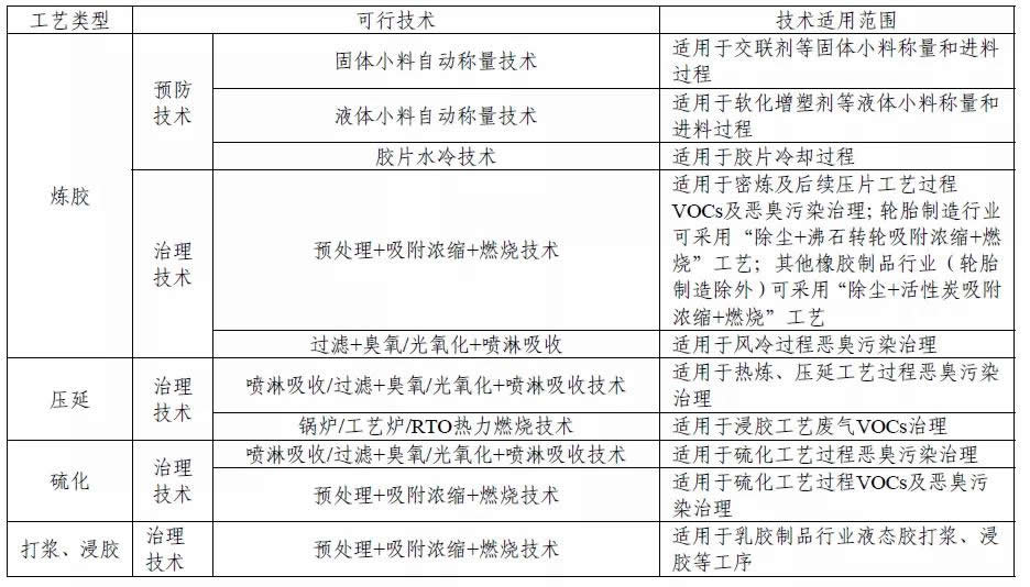 下面分享橡胶制品业VOCs 污染治理可行技术组合表,如下: